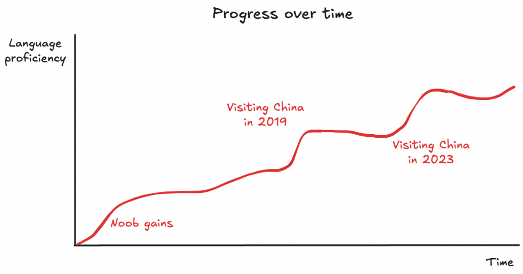 I’ve made steady progress for the last 7 years to the point that I’d consider myself intermediate to upper-intermediate (whatever that means). I do have weeks or months where I barely study at all. I’ve had the opportunity to visit China twice which definitely boosted my level a lot, and gave me something clear to toward towards each time. Here’s a chart.