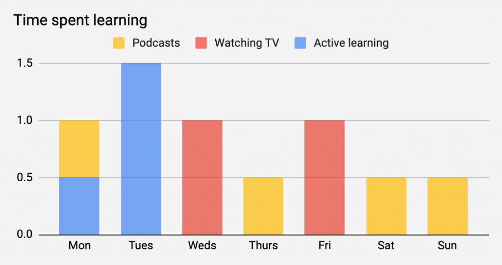 A fairly typical week. I have Tuesday lessons and to listen to Chinese podcasts when I walk to work or go for a run. Most of the week is passive learning.